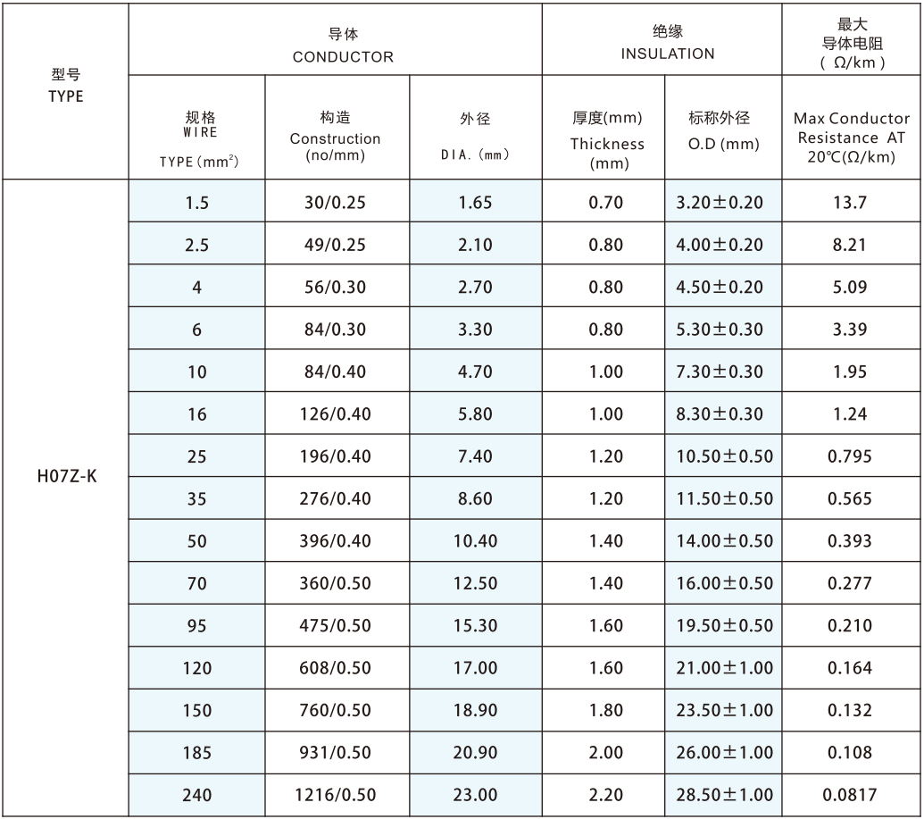 The conductor adopts five types of conductors, 1.5-240mm2 Tin plated or bare copper wire