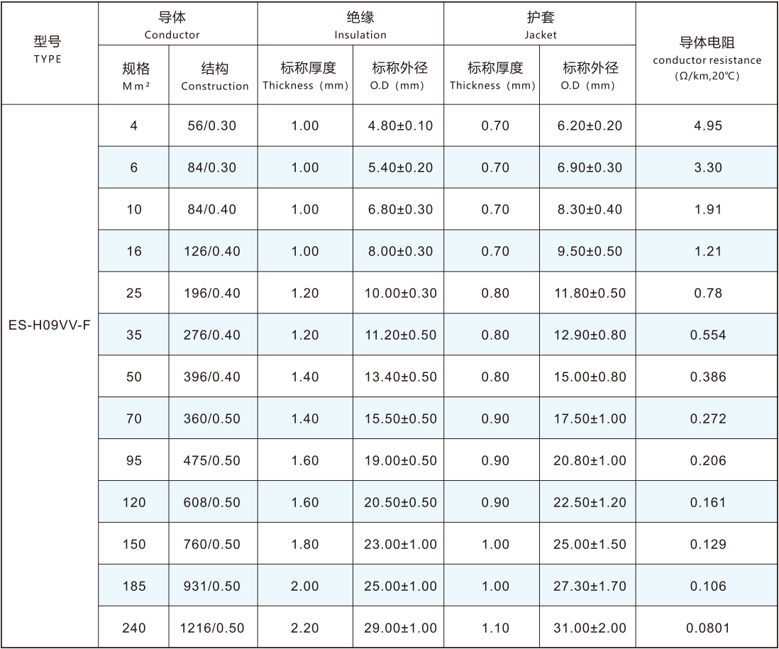 The conductor adopts IEC60228-2004 standard Class 5 or Class 6 conductor 4.0-240mm2 tin plated or bare copper