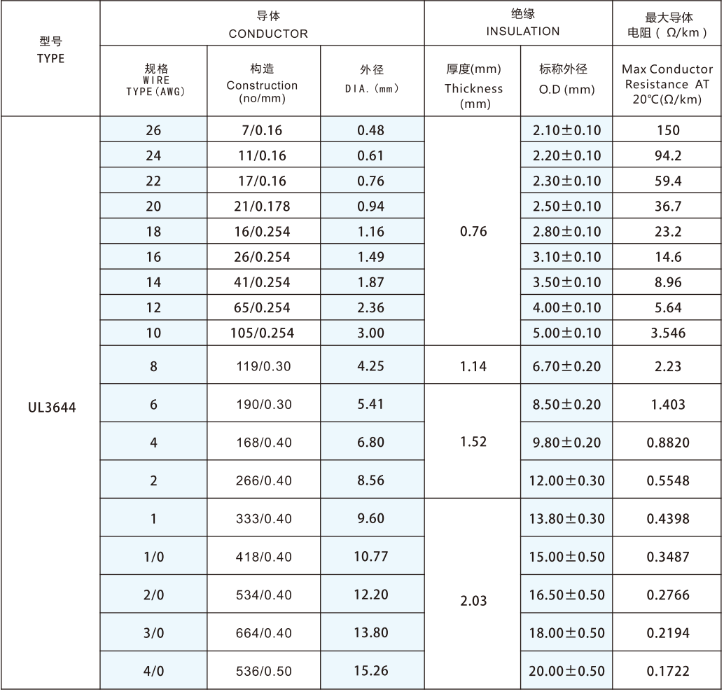 導(dǎo)體采用單根或絞合30-4/0AWG鍍錫或裸銅絲